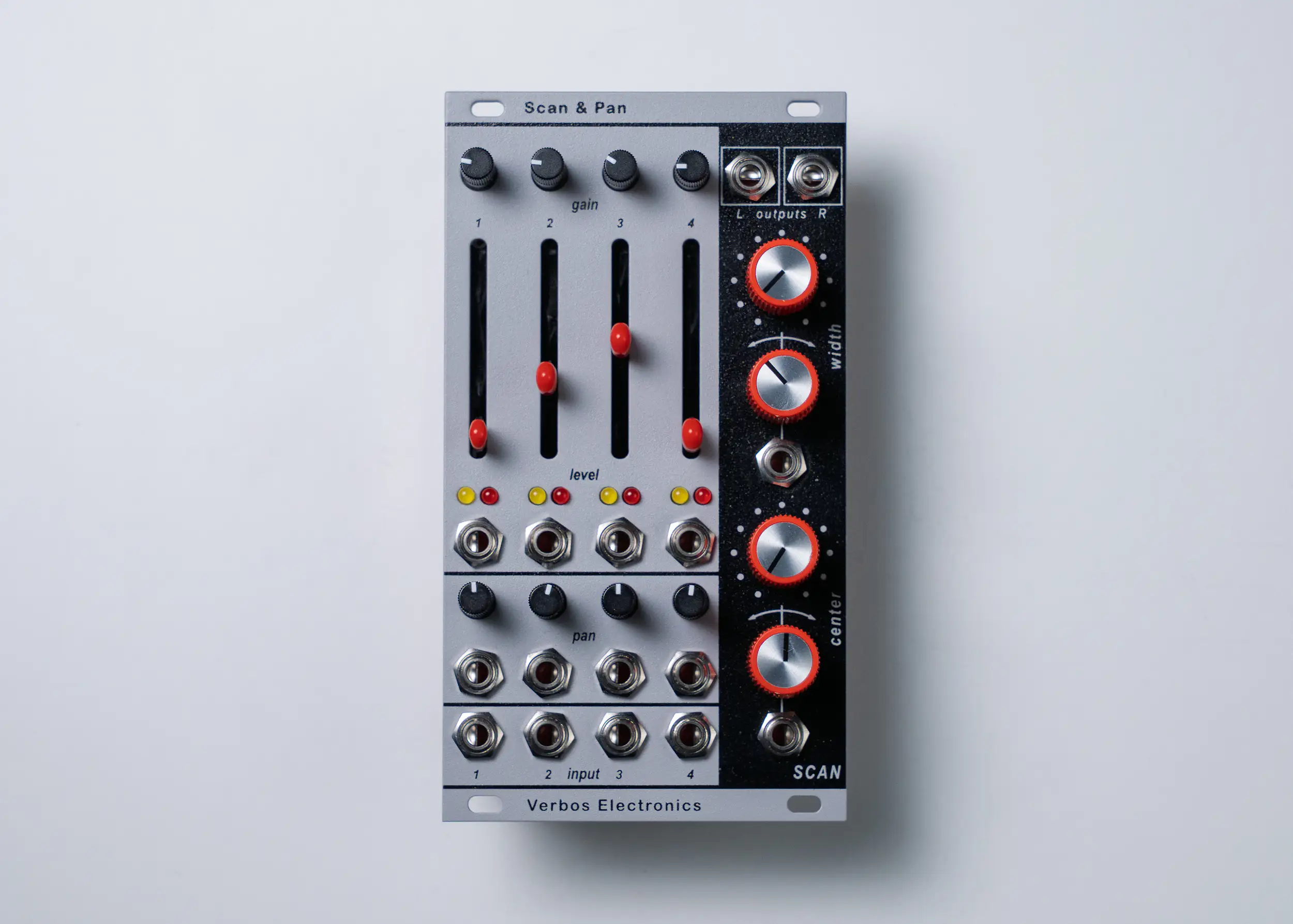 In a minuscule amount of space, the Scan & Pan provides a 4 channel mixer with voltage control of level and panning. Since the level control was already there, the “width” and “center” controls from the Harmonic Oscillator are included to allow the user to Scan across the channels, fade between them or actively mix them together. It’s signal path is all discrete transistors.